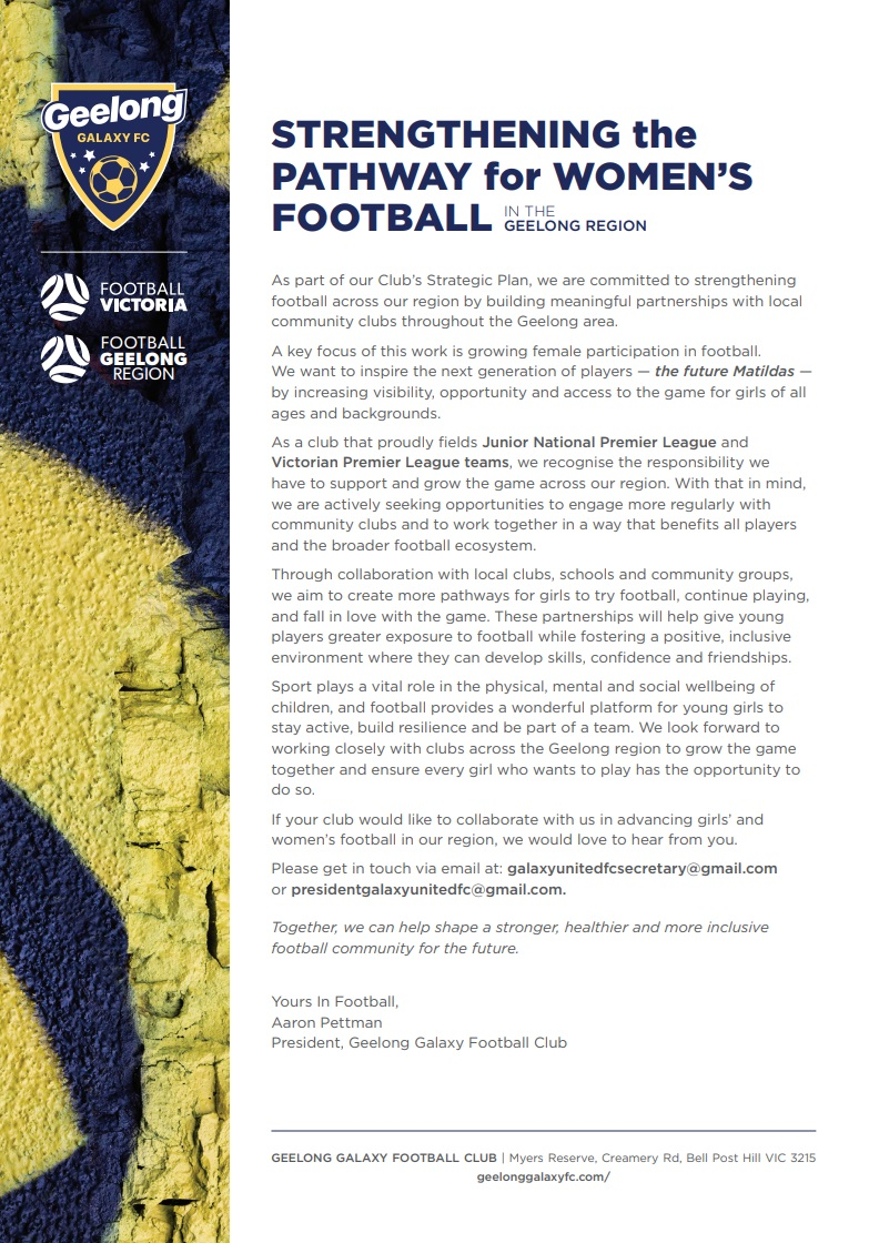Geelong Galaxy FC is a female only football (soccer) club. Our objective is to empower our players and provide pathways to be able to achieve their football dream, regardless of how big that may be.